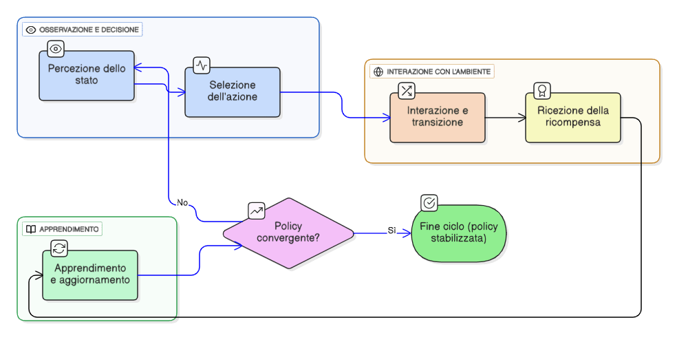 5. Apprendimento e aggiornamento: l’agente registra l’intera esperienza (stato iniziale, azione, ricompensa, nuovo stato) e la utilizza per aggiornare la sua policy o la sua funzione di valore. È questo il momento in cui avviene l’apprendimento vero e proprio, affinando la strategia per le decisioni futuro.